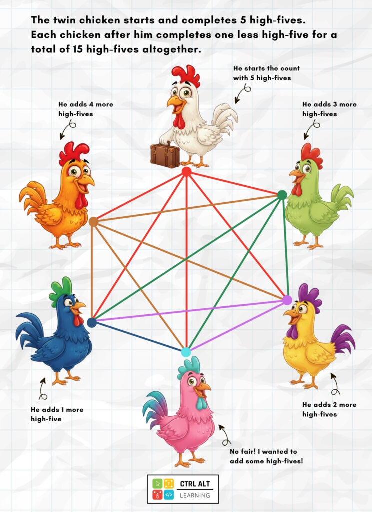 The second chicken will only give 4 high-fives because the twin chicken already high-fived him.
